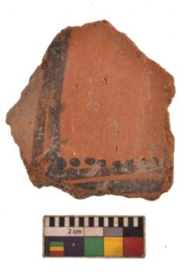 | Description / विवरण | Specimen of black on red ware with black decorative Lines and dots geometric painting. |