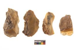 | Description / विवरण | There are n 4 utilized flakes. There are multi directional irregular scar pattern on both dorsal and ventral face of the flakes. three have tapering at one end and one has sharp edge. |
