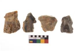 | Description / विवरण | There are n 4 utilized flakes. There are multi directional irregular scar pattern on both dorsal and ventral face of the flakes. two have tapering at one end and two have sharp edges. |