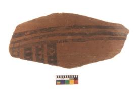 | Description / विवरण | Specimen of Potsherd black on red painted pottery. It is fine fabric in sharp contrast with painted design are executed in black pigment. |