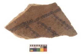 | Description / विवरण | Specimen of Potsherd black on red painted pottery. It is fine fabric in sharp contrast with painted design are executed in black pigment. |
