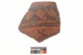 | Description / विवरण | Specimen of black on red ware with black decorative Double axe like design and horizontal lines geometric painting. |