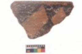 | Description / विवरण | Specimen of black on red ware with black decorative Double axe like design geometric painting. |