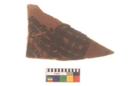 | Description / विवरण | Specimen of Potsherd with black decorative geometric diamond set broad horizontal bands painting. |