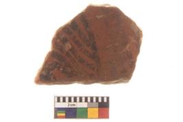 | Description / विवरण | Specimen of Potsherd black on red painted pottery. It is fine fabric in sharp contrast with painted design are executed in black pigment. |