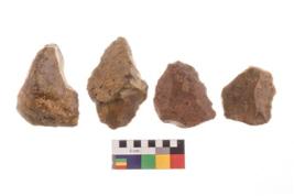 | Description / विवरण | There are n 4 utilized flakes. There are multi directional irregular scar pattern on both dorsal and ventral face of the flakes. Two have tapering at one end and two have sharp edges. |