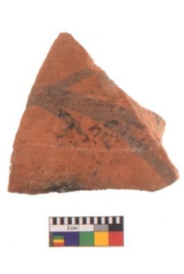 | Description / विवरण | Specimen of black on red ware with black decorative Leaf motif geometric painting. |
