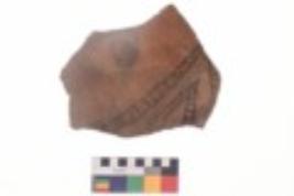| Description / विवरण | Specimen of black on red ware with black decorative Lattice leaf and circle geometric painting. |