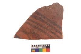 | Description / विवरण | Specimen of black on red ware with black decorative Joint curves with parallel horizontal lines geometric painting. |