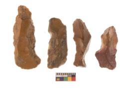 | Description / विवरण | There are n 4 utilized flakes. There are multi directional irregular scar pattern on both dorsal and ventral face of the flakes. One has sharp edge and three have tapering edges. |