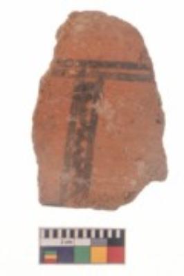 | Description / विवरण | Specimen of black on red ware with black decorative Horizontal lines and wavy lines in between vertical lines geometric painting. |