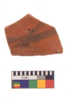 | Description / विवरण | Specimen of black on red ware with black decorative Half circle joined on a horizontal line geometric painting. |