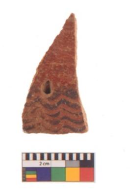 | Description / विवरण | Specimen of black on red ware with black decorative Joint wavy lines geometric painting. |