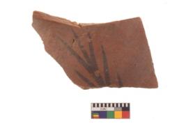 | Description / विवरण | Specimen of black on red ware with black decorative Leaf motif geometric painting. |
