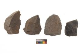 | Description / विवरण | There are n 4 utilized flakes. There are multi directional irregular scar pattern on both dorsal and ventral face of the flakes. Three have tapering at one end and one has blunt edge. |