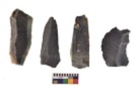 | Description / विवरण | There are n 4 utilized flake cores. There are multi directional irregular scar pattern on both dorsal and ventral face of the flake cores. All of them are tapering at one end. |