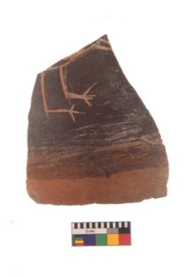 | Description / विवरण | Specimen of black on red ware with black decorative Incised animal figure geometric painting. |