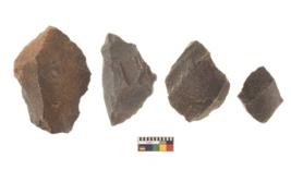 | Description / विवरण | There are n 4 utilized flakes. There are multi directional irregular scar pattern on both dorsal and ventral face of the flakes. One is tapering at one end and three have sharp edges. |