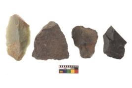 | Description / विवरण | There are n 4 utilized flakes. There are multi directional irregular scar pattern on both dorsal and ventral face of the flakes. One has blunt edge and three are sharp at one end. |
