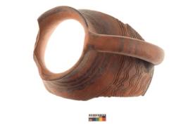 | Description / विवरण | Specimen of black on red ware with black decorative Concentric circles at the neck and wavy incised lines on the body geometric painting. |