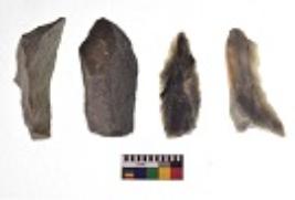 | Description / विवरण | There are n 4 utilized flake cores. There are multi directional irregular scar pattern on both dorsal and ventral face of the flake cores. Three are tapering at one end and one has sharp edge. |
