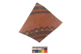 | Description / विवरण | Specimen of black on red ware with black decorative Concentric circles with wavy lines in between geometric painting. |