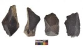 | Description / विवरण | There are n 4 utilized flake cores. There are multi directional irregular scar pattern on both dorsal and ventral face of the flake cores. Two are tapering at one end and two have blunted edges. |
