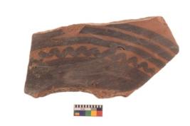 | Description / विवरण | Specimen of black on red ware with black decorative Concentric circles with wavy line in between geometric painting. |