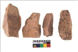 | Description / विवरण | Specimen of flake tools with prominent flaking marks. They are made up of a short flakes with sides trimmed. |