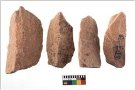 | Description / विवरण | There are n 4 utilized flake cores. There are multidirectional irregular scar pattern on both dorsal and ventral face of the flake cores. One has sharp edges and three have blunted edges. |