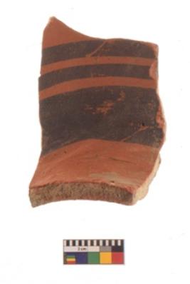 | Description / विवरण | Specimen of black on red ware with black decorative Parallel lines geometric painting. |