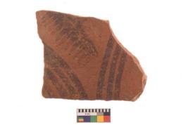 | Description / विवरण | Specimen of black on red ware with black decorative Parallel concentric lines with small lines in between geometric painting. |