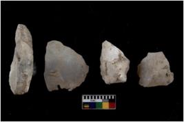 | Description / विवरण | There are n 4 flakes tool; there are flakes tool with prominent flaking marks. It made up of a large flakes with sides trimmed. |