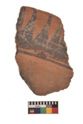| Description / विवरण | Specimen of black on red ware with black decorative Group of elongated vertical triangles geometric painting. |