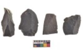 | Description / विवरण | There are n 4 utilized flake cores. There are multi directional irregular scar pattern on both dorsal and ventral face of the flake cores. Two are tapering at one end and two have blunted edges. |