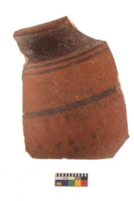 | Description / विवरण | Specimen of black on red ware with black decorative Parallel lines geometric painting. |