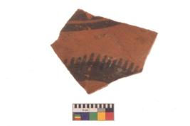 | Description / विवरण | Specimen of black on red ware with black decorative Semi circle with projecting smal vertical lines geometric painting. |