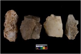 | Description / विवरण | There are n 4 utilized flake cores. There are multi directional irregular scar pattern on them. One has sharp edge and three are tapering at one end. |