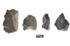 | Description / विवरण | There are n 4 utilized flake cores. There are multi directional irregular scar pattern on both dorsal and ventral face of the flake cores. One is tapering at one end and three have blunted edges. |