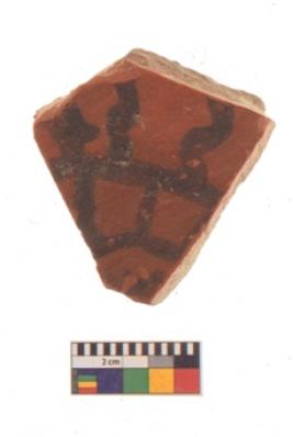 | Description / विवरण | Specimen of black on red ware with black decorative Parallel lines with vertical lines between them and wavy lines below geometric painting. |