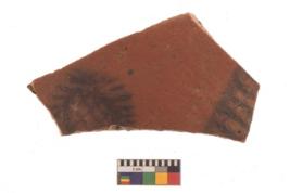 | Description / विवरण | Specimen of black on red ware with black decorative Lattice with small horizontal lines geometric painting. |