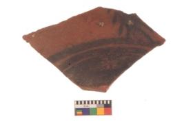 | Description / विवरण | Specimen of black on red ware with black decorative Concentric circles with a leaf motif geometric painting. |