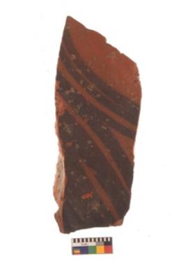 | Description / विवरण | Specimen of black on red ware with black decorative Concentric circles geometric painting. |