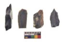 | Description / विवरण | There are n 4 utilized flake cores. There are multi directional irregular scar pattern on both dorsal and ventral face of the flake cores. Three are tapering at one end and one has sharp edge. |