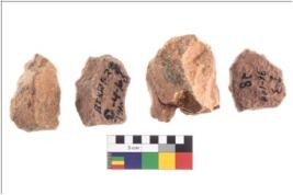 | Description / विवरण | Specimen of flake tool with prominent flaking marks. They are made up of a short flakes with sides trimmed and rectangular in shape. |