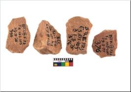 | Description / विवरण | Specimen of flake tool with prominent flaking marks. They are made up of a short flakes with sides trimmed. |