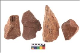 | Description / विवरण | Specimen of flake tool with prominent flaking marks. They are made up of a short flakes with sides trimmed and most of them are rectangular in shape. |