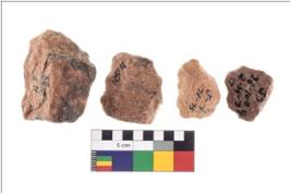 | Description / विवरण | Specimen of flake tool with prominent flaking marks. They are made up of a short flakes with sides trimmed and most of them are rectangular in shape. |