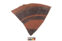 | Description / विवरण | Specimen of black on red ware with black decorative Parallel semi circles with small vertical projections geometric painting. |