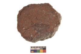 | Description / विवरण | Specimen of ground disc hopscotch made from a red ware. It has jagged edges with sign of chipping. It is rounded in shape. |
